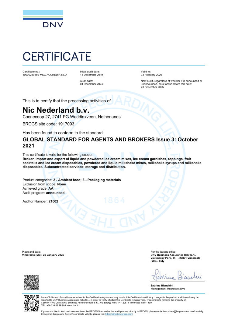 Nic Foodservice is BRC Agents & Brokers gecertificeerd, we hebben hierin de AA-status bereikt. Ook werken we aan de hand van de door onze moedermaatschappij opgezette OFSS (Orkla Food Safety Standard) richtlijn. Deze richtlijn gaat verder dan alleen productkwaliteit en voedselveiligheid, hierin zijn namelijk ook milieu en maatschappelijke doelstellingen opgenomen. Deze richtlijn heeft betrekking op onze werkzaamheden maar stelt dezelfde eisen ook aan onze leveranciers, dit zorgt voor waarborging in de gehele keten. Met betrekking tot OFSS heeft Nic Foodservice eveneens de hoogst haalbare status bereikt. Want naar onze mening zijn kwaliteit, smaak, veiligheid, milieu en maatschappelijk verantwoord onlosmakelijk met elkaar verbonden.